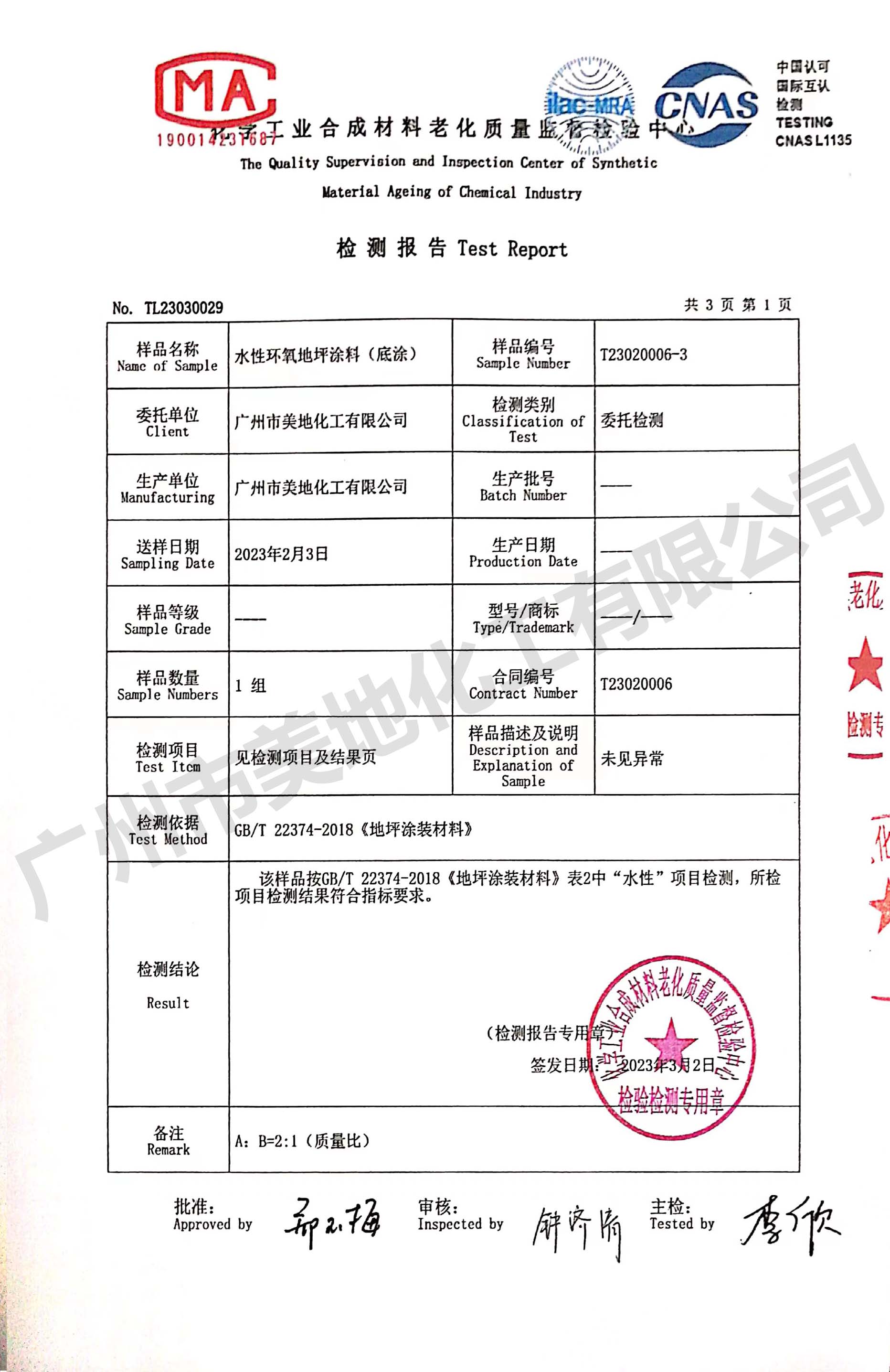 環氧自流平地坪漆檢驗證書